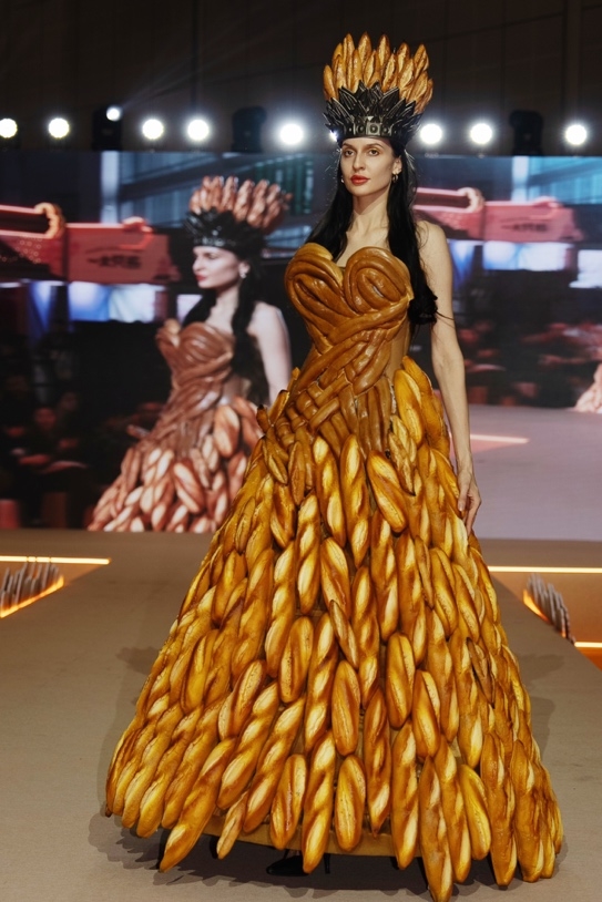其中8套面包主题高定时装以"宫"为主题,麦香为引,在T台上筑起一座流动的宫殿,在这一季的设计语言中,可颂的金黄不再止于味蕾,它攀上肩颈,化作飞檐的弧度;甜甜圈的圆满不再囿于掌心,它嵌入腰封,成为天圆地方的隐喻。当碱水包遇见马面裙,当牛角包邂逅旗袍,这不仅是食材与面料的结合,更是一种年轻的时尚“发酵”。琉璃瓦的金、宫墙的朱红、杏花微雨时的浅粉、麦浪翻涌时的暖黄是这一季的主题色。用面料与肌理,体现五谷丰登的华贵;把配饰与时装变成可食用的珍宝。这是一场关于东方美学与烘焙艺术,在精神宫殿里的巅峰对话。